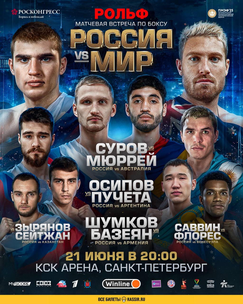 21 июня в рамках Петербургского экономического форума пройдёт матчевая встреча по боксу «Сборная России – сборная мира», организованная Спортивной федерацией бокса Санкт-Петербурга, Федерацией бокса России и промоутерской компанией СОЮЗ.